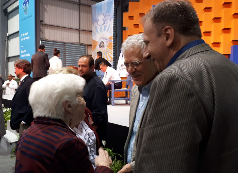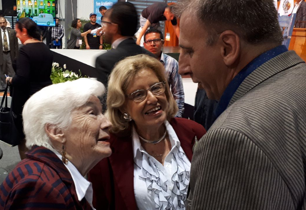 La esposa de Sergio Galindo y la ex Embajadora ante la OEA de Uruguay expresando un afectuoso saludo con motivo de la recepción del Premio Sergio Galindo a Primera Novela, en la inauguración de la Feria Internacional del libro Universitario 2018 en la Universidad de Veracruz, México.