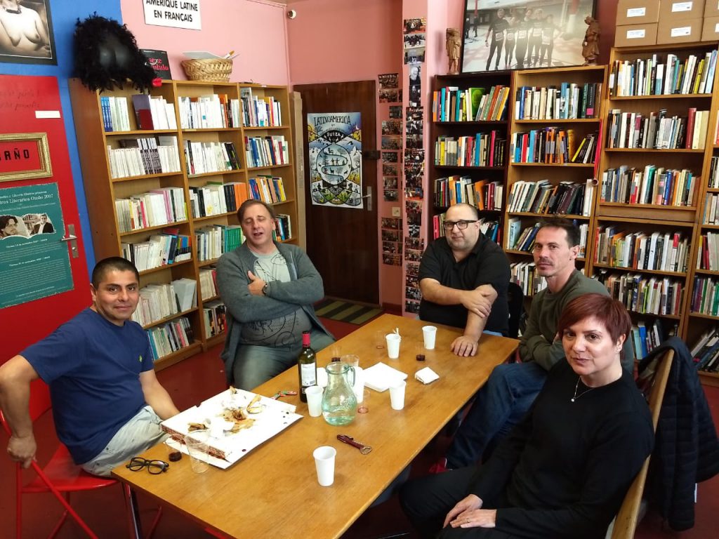 De izquierda a derecha el escritor y traductor suizo Pierre Fankhauser, escritor Guillermo Ferreyro, el librero peruano suizo Rodrigo Díaz Pino, la escritora María Insúa, los escritores Enrique Decarli y Ariel Bermani.